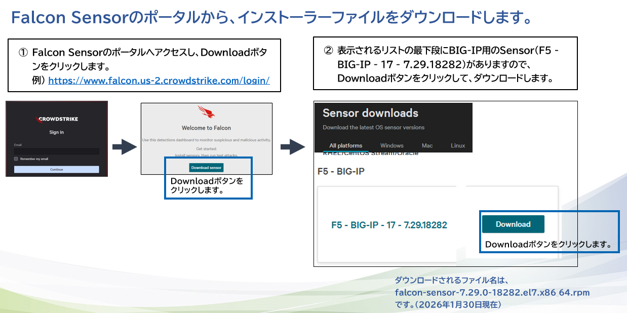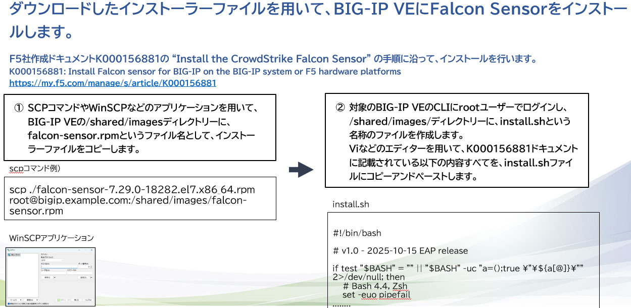 FalconセンサーはBIG-IPにインストール可能で、導入手順はF5社のMyF5ポータルでも案内されています。インストール作業はCLIから比較的簡単に実施でき、センサーはCrowdStrikeから入手します。