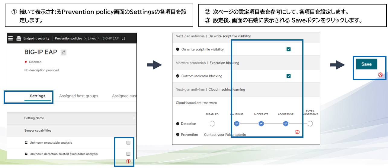CrowdStrikeのGUIにログインしPrevention policyを設定します。Prevention policyは、脅威の検知や、攻撃から保護するための、ルールセットです。