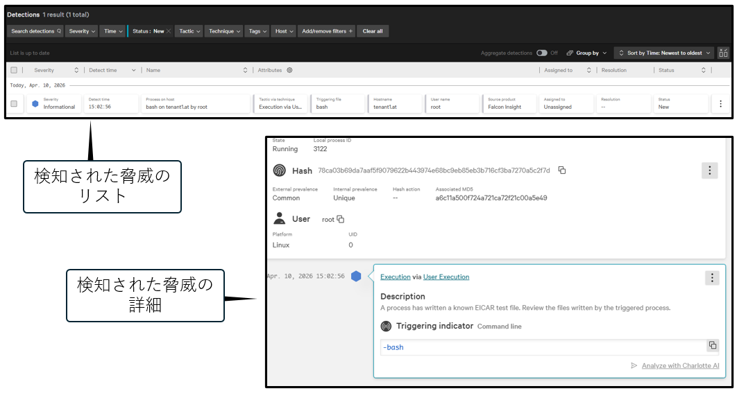 EICARテストファイルをBIG-IPにアップロードし、Falconセンサーが検知して、CrowdStrikeのクラウドサービスのGUI上からどのように見えるのか確認してみました。EICARは、テストで実際のコンピュータウイルスを使うと具体的なダメージが生じてシステムが破損し、正しく動作できない可能性があるため、そのような問題を起こさずに検知のテストをすることを意図しています。