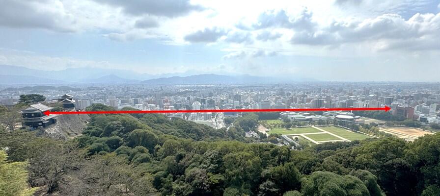 標高130mほどの小高い山の頂にある松山城(馬具櫓)と、麓にある愛媛CATV社屋との間(約800m)をCENTAURIで接続し、2025年11月7日から12月17日までの約1か月にわたり通信状況を確認しました。