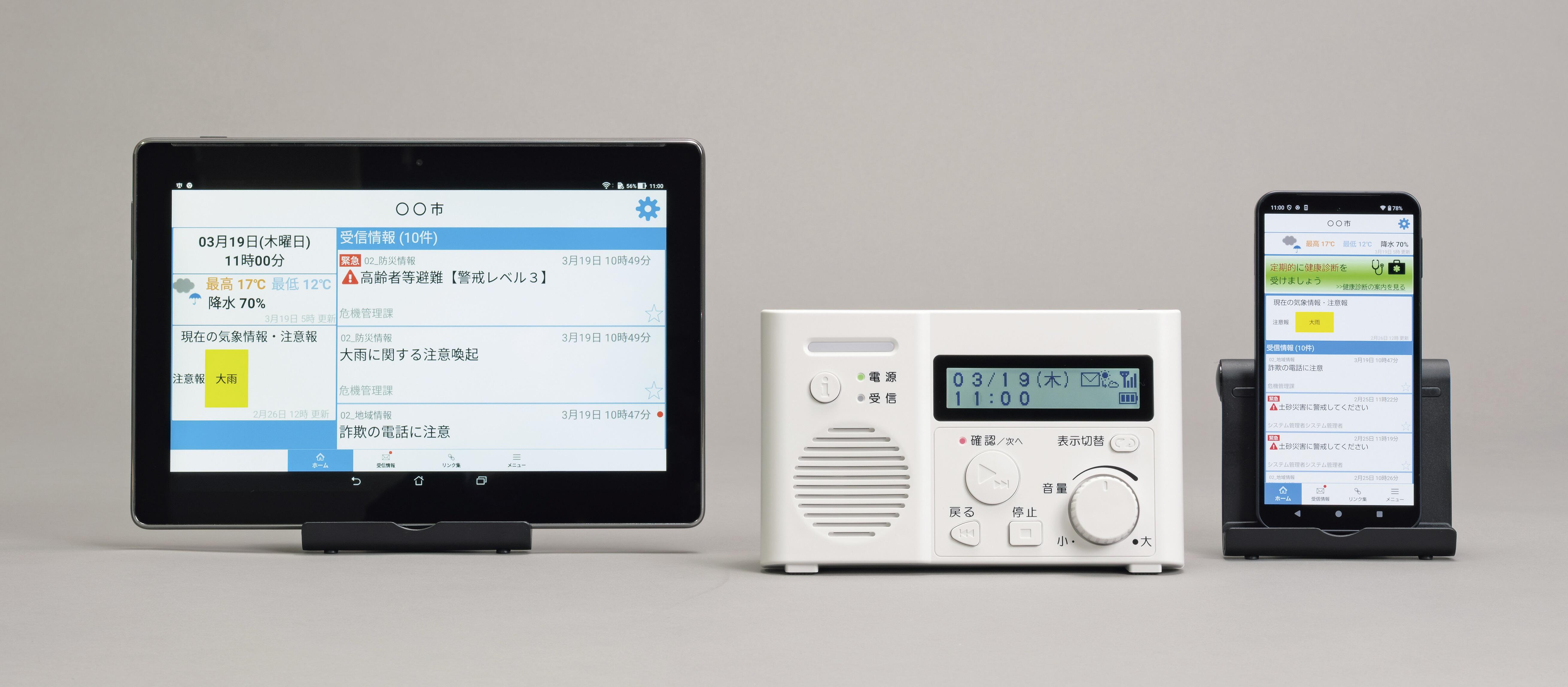 屋外子局用受信機・戸別受信機・スマホアプリに配信できる唯一のサービスです。