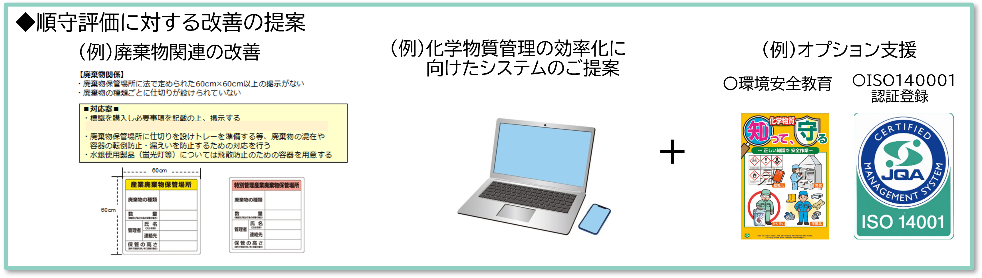 法規制調査+順守評価+改善提案(教育含む)の3ステップで、確実な法令順守と安全管理を実現