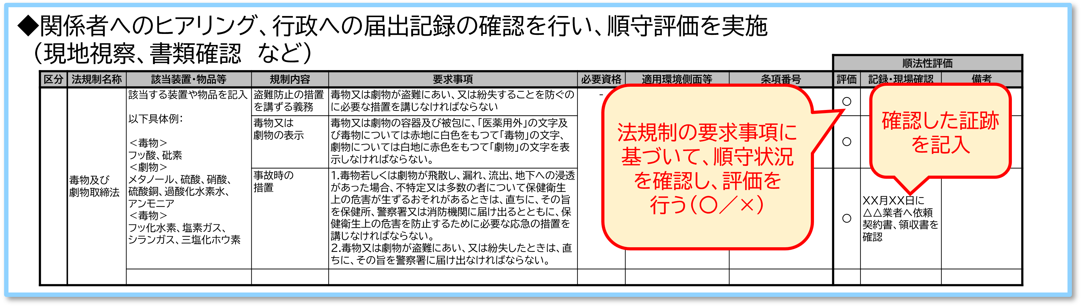 調査状況に基づき、順守評価を実施、現場の実態や運用状況を確認し、実際の管理状況を評価します。