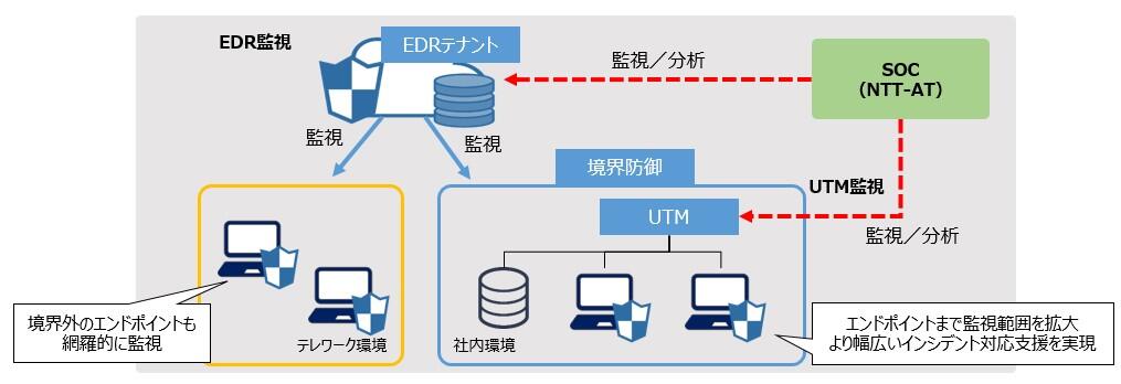 NTT-ATの「FortiGate SOCサービス プラスEDRオプション」は、UTMに加えてEDRを監視し、脅威を検知した場合には、端末の通信遮断(隔離)することで被害の拡大を防止します。