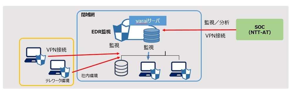 閉域網の環境で監視をするために、閉域網にyaraiサーバを設置し、SOCがVPN経由でyaraiサーバに接続してyarai端末を監視します。