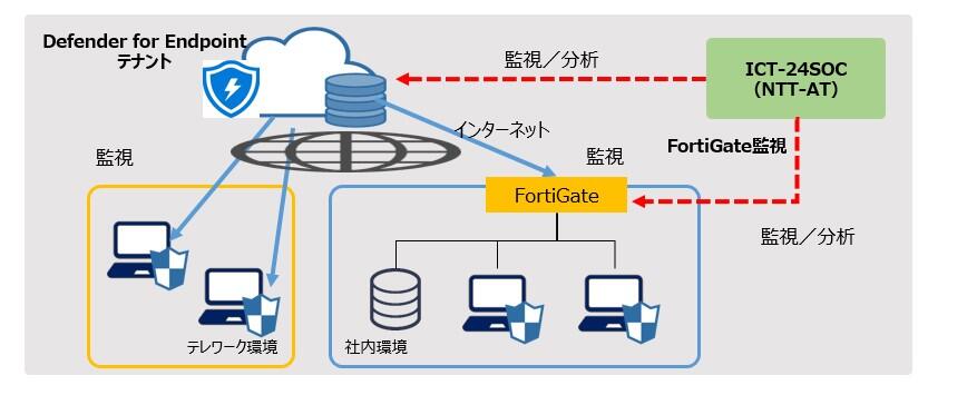 端末の異常を端末監視ソフト(Defender for Endpoit)で、ネットワーク通信の異常をネットワークのセキュリティ監視機器(FortiGate)で、リモートでICT-24SOCが監視します。異常を検知したら、ネットワークの通信の遮断設定や端末の通信の遮断(隔離対応)をリモートでICT-24SOCが実施します。