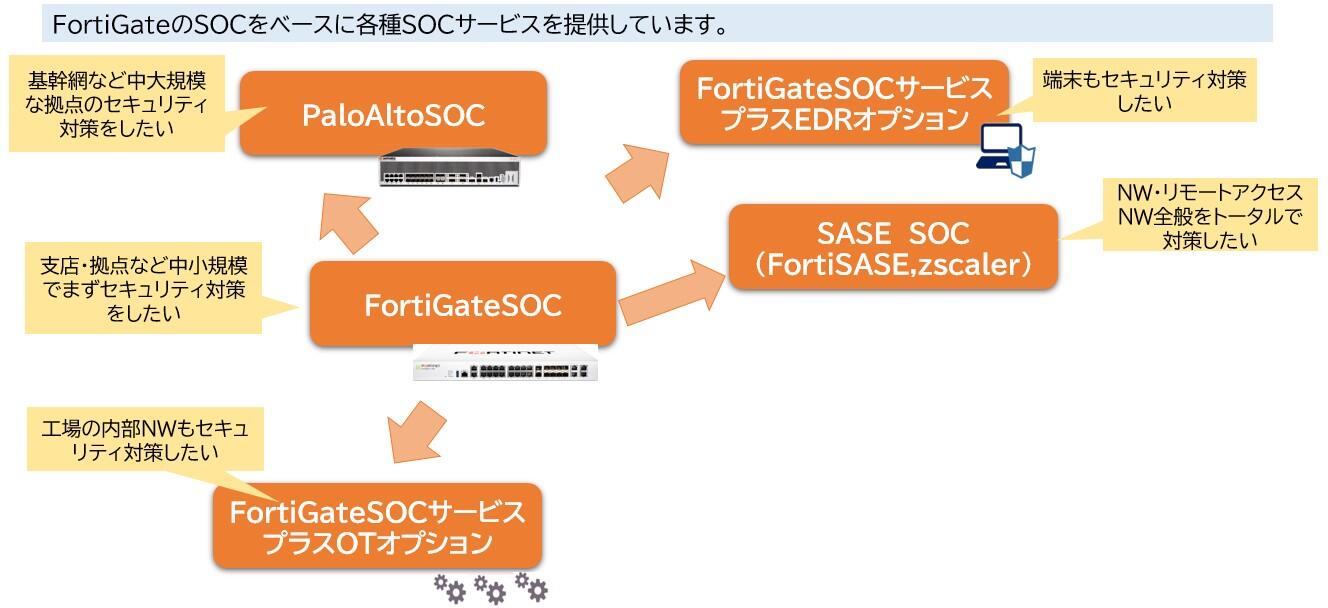 ICT24-SOCでは、FortiGateなど、各種の監視対象機器に対応して、各種のSOCメニュを用意しております。