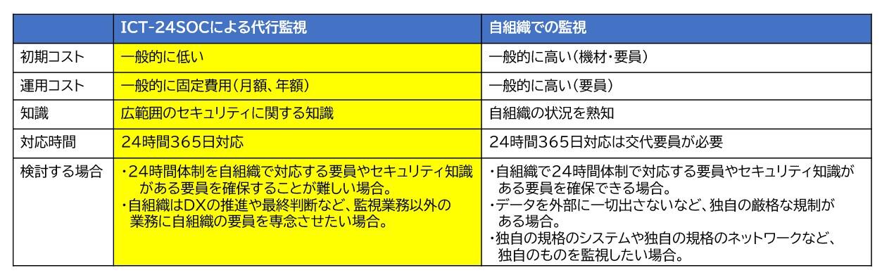ICT-24SOCによる代行監視と自組織による監視の比較