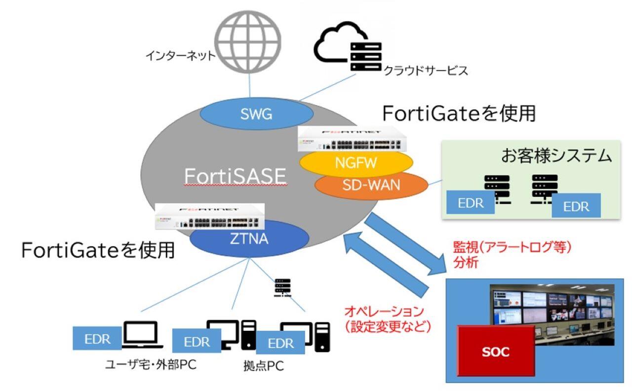 EDR(Endpoint Detection and Response)のような端末の監視だけでなく、FortiGateなどのUTM(NW機能とセキュリティ機能が一体化したもの、NGFWとも呼ばれている)を使用した異常通信の監視の実績もあり、FortiSASEの豊富な機能を活用して、お客さまの環境を監視、防御設定をします。