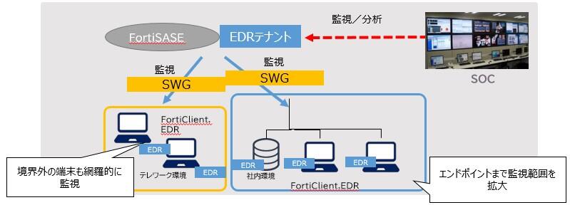 端末に絞り込んで監視運用をします。FortiSASEのFortiClient(端末管理プログラム)とSWGにより悪意のあるWebアクセスの遮断、端末のマルウェア感染などの状態監視をします。あわせてインシデント時にはEDRを使用して端末内部の調査を実施します。