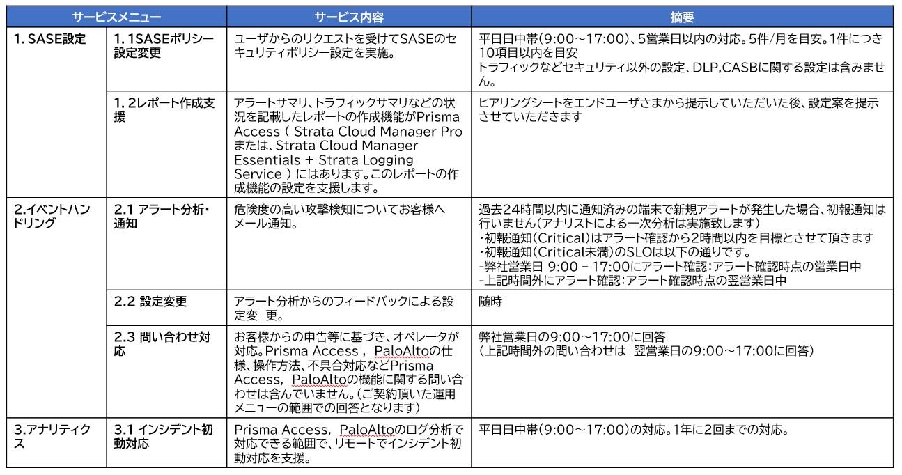 「SASE SOC(Prisma Access)」のサービスメニュー