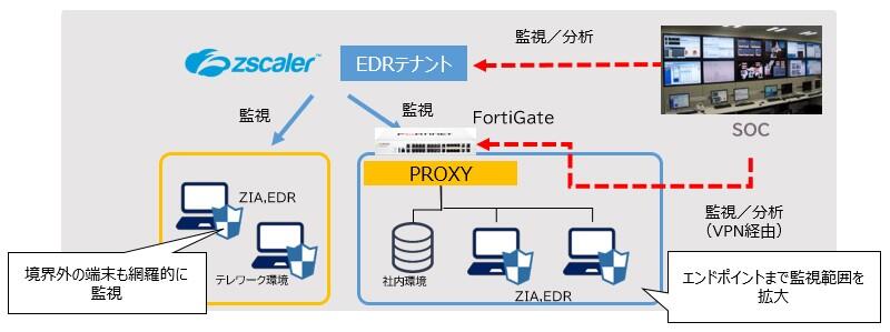 端末をZIA(Zscaler Internet Access)、EDRで監視し、ZIA(Zscaler Internet Access)、EDRを導入できないコピー機などの異常通信はFortiGateなどUTM(NW機能とセキュリティ機能を一体化した機器)で監視します。また、UTMにより社外の攻撃者からの通信を防御します。