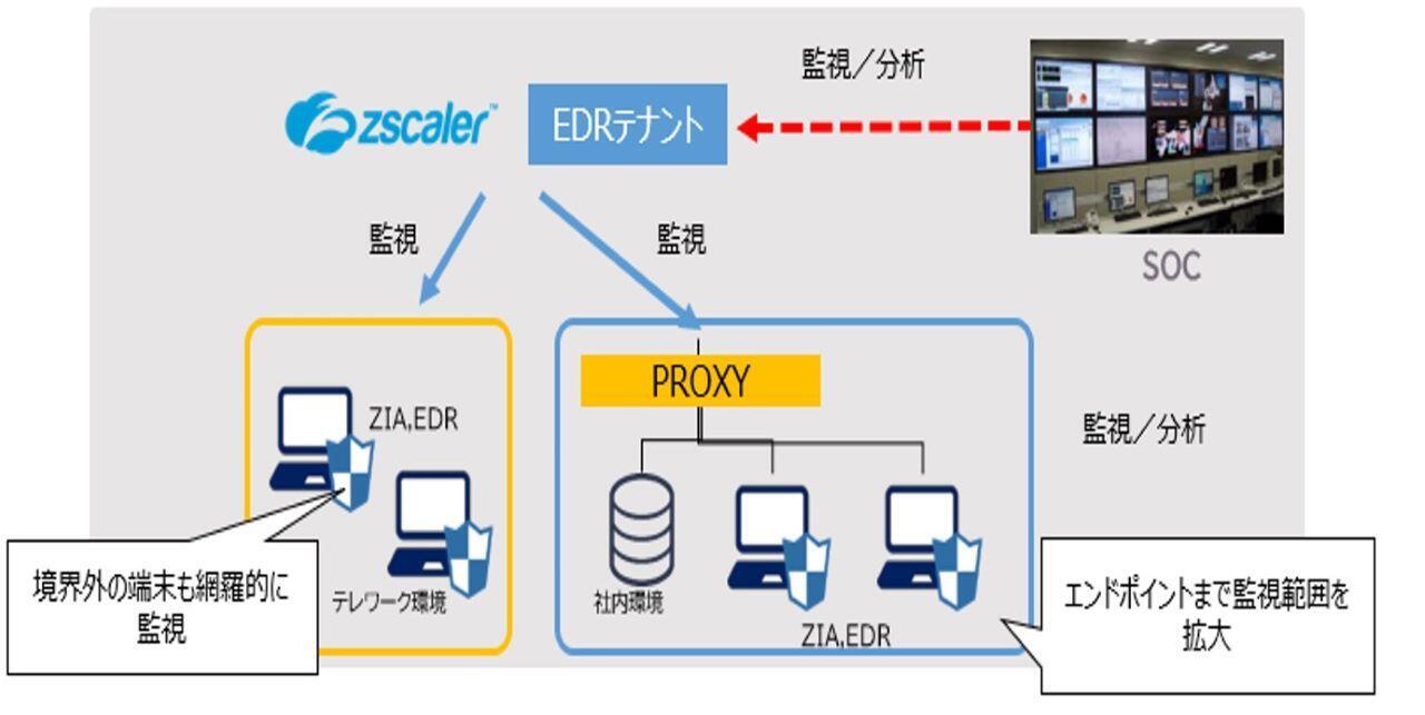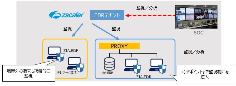 ZIA(Zscaler Internet Access)でWebアクセスの履歴を、EDRで端末内を監視します。ZIA(Zscaler Internet Access)、EDRのサーバはクラウド上にあるため、社外の持ち出し端末でも監視可能です。また、社内の端末もPROXY経由で監視可能であるため、社内NWの変更設定は少ないものになります。