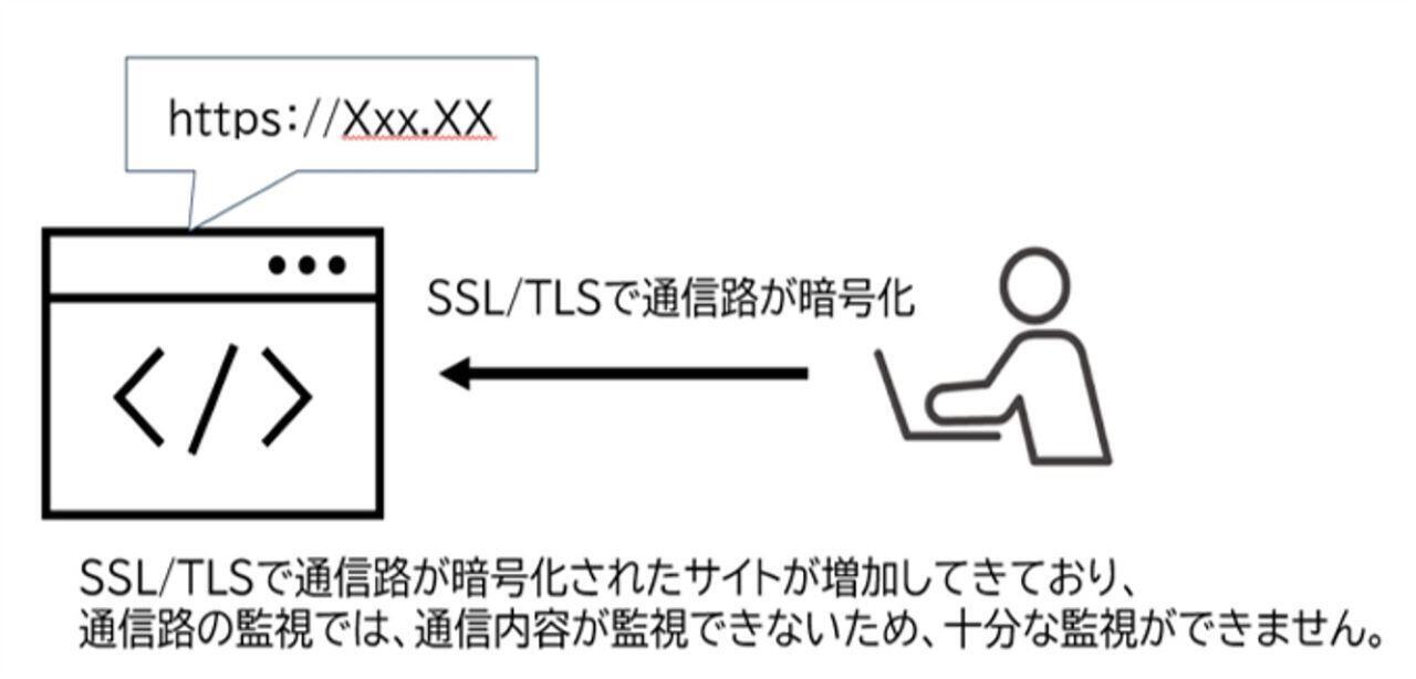 SaaSなどインターネットサービスは SSL/TLSなど暗号化された通信経由でアクセスされるサービスが増加してきました。暗号化された通信では通信内容が監視できないため、従来の通信路を監視するソリューションでは、十分な監視ができなくなっています。