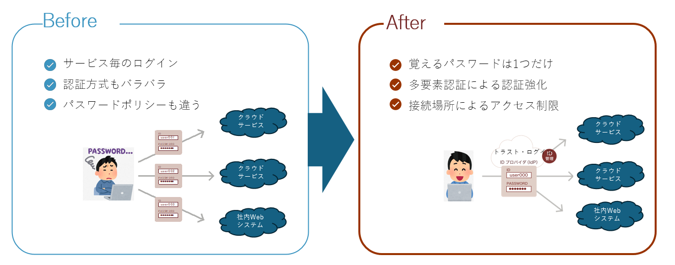パスワード管理に追われ、クラウドサービスのログイン情報が煩雑になり、セキュリティ強化と運用負荷の両立に悩む。